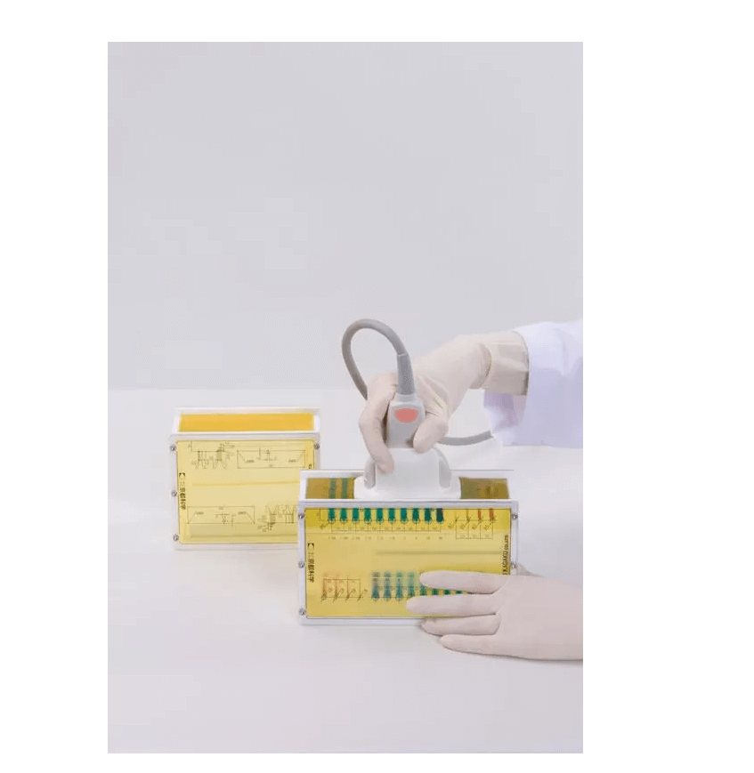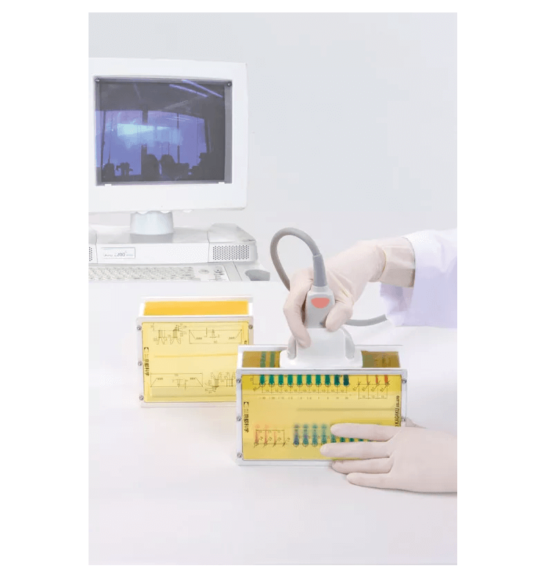 Das Brust-Phantom ist ein spezialisiertes Phantom, das speziell für die Hochfrequenz-Sonografie bei 10 MHz entwickelt wurde, wie sie in der Brustuntersuchung verwendet wird. Es enthält eine Vielzahl von Zielen, die für die präzise Durchführung und das Training von Ultraschalluntersuchungen der Brust erforderlich sind. Das Phantom umfasst 4 verschiedene Zielarten: Graustufen-, Hohlraum-, Punkt- und 45°-Linienziele. Es besteht aus zwei Übungsblöcken, die realistische Bedingungen für die Durchführung von Brustuntersuchungen simulieren und somit für die Ausbildung und Kalibrierung von Ultraschallgeräten ideal sind.