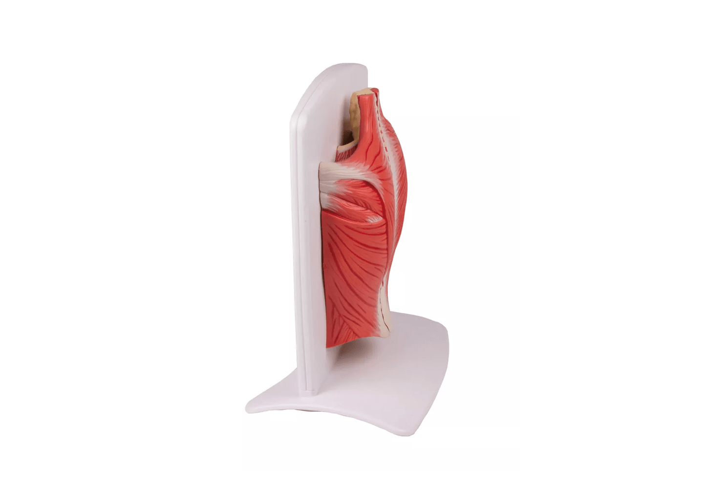 Das Modell stellt eine vollständige Ansicht der oberflächlichen, mittleren und tiefen Rückenmuskulatur dar.