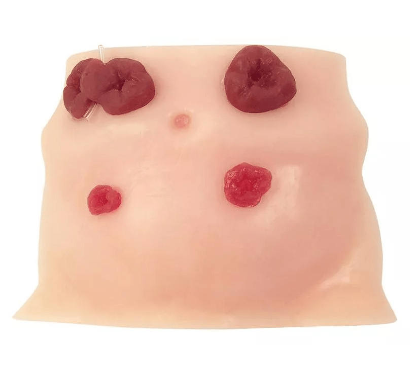 Dieses Modell wurde entwickelt, um die Pflege und Behandlung von Patienten mit Stomata zu simulieren. Es umfasst vier realistische Stomata, die mit Gleitmittel versehen sind und mit einem eingeführten Finger erweitert werden können, was eine praxisnahe Übung der Stomaversorgung ermöglicht. Das Modell lässt sich einfach waschen und bietet die Möglichkeit, Pflaster und Verbände anzubringen. Ebenso können Stomabeutel auf den entsprechenden Stomata angebracht werden, um die vollständige Versorgung zu üben. Es ist ein ideales Trainingswerkzeug für Pflegekräfte und medizinisches Fachpersonal, das die richtige Pflege und Handhabung von Stomata erlernen möchte.